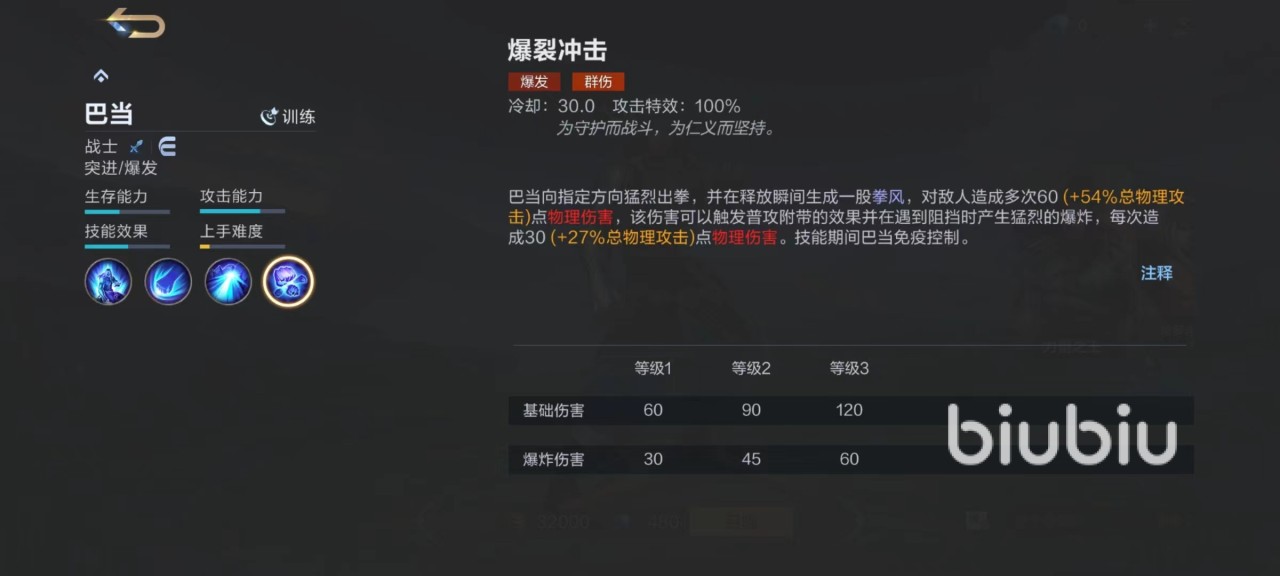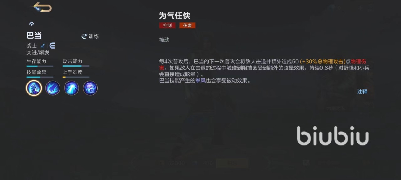 作为战士英雄,巴当自然在爆发输出和突进等方面都很有优势。在每四次普攻后,下一次普攻就会获得强化效果,命中敌人时将对方击退,并附加额外伤害。敌人在被击退的过程中如果接触到阻挡,将会受到额外眩晕效果,这就要求大家在输出时候要找好位置,尽量使自己面对敌人,然后敌人背后是地形障碍,这样可以起到额外效果。