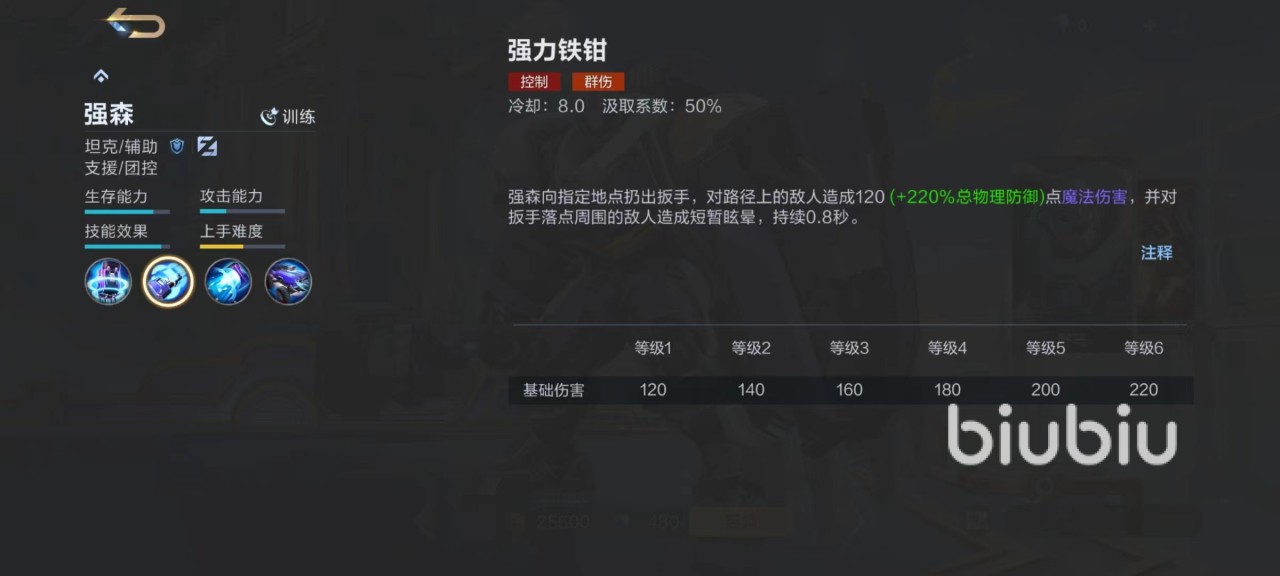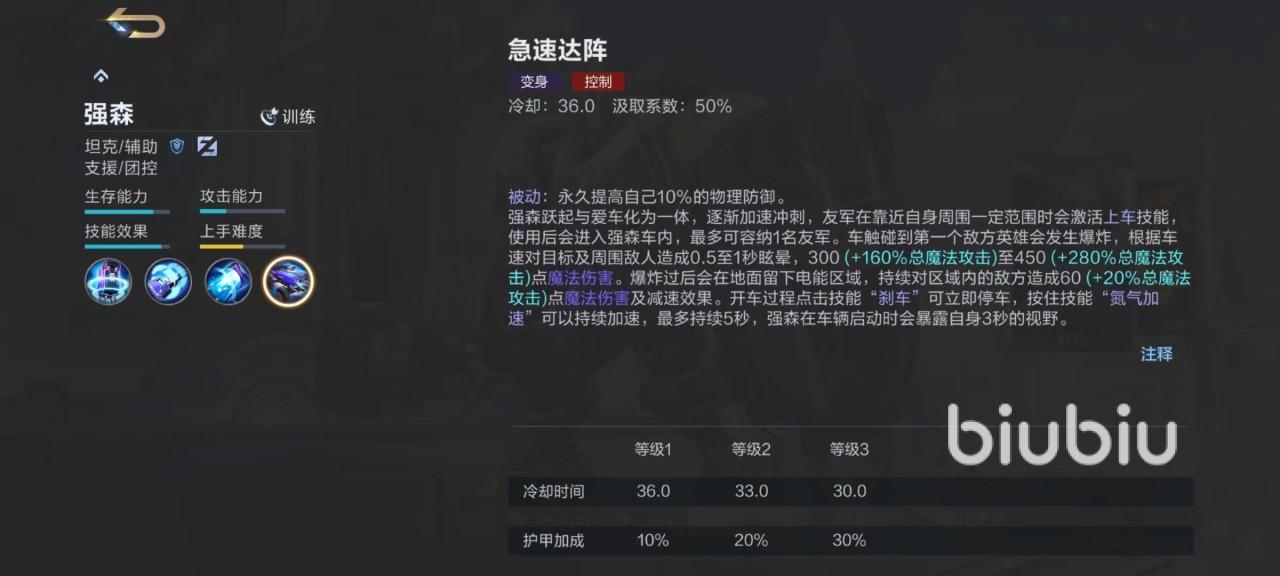 作为一名坦克角色,自然生存能力方面比较优秀,控制效果上也是数一数二的,而且这还是一位能够变身为汽车的坦克,造型方面很有特点。自身被动效果为当生命值降低到30%以下的时候,立即获得一个护盾,等物理防御越多护盾也就越厚,护盾将持续10秒钟,触发一次之后有100秒的内置冷却时间。