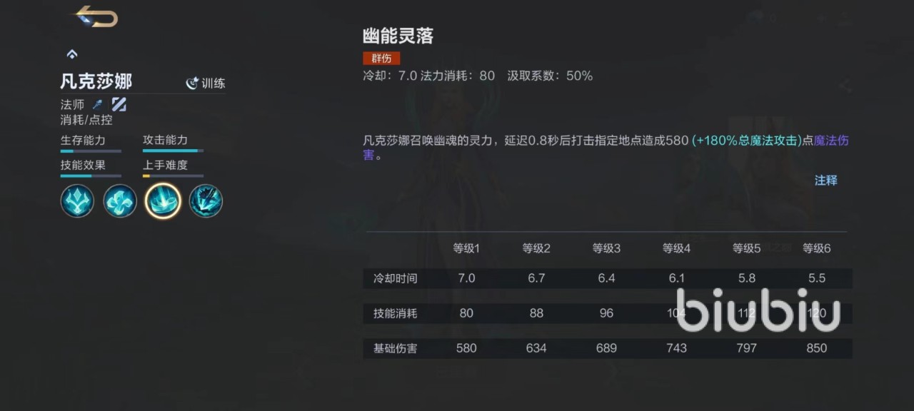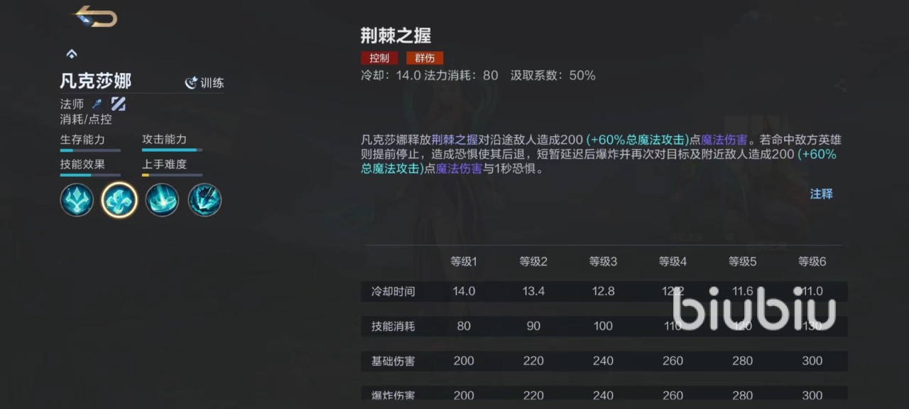大家通过属性条就可以看出,凡克莎娜的攻击能力已经接近满值,控制效果也很好,而且上手难度极低,虽然生存能力比较差,但是有着距离上的优势。凡克莎娜伤害都会为目标添加印记,当目标被击败时,印迹会自动爆炸,对周围敌人造成范围伤害。一技能在使用时候需要选定攻击路径,对整条路就向敌人造成伤害,敌人被命中后会短暂后退,受到暂时控制,并且暴露自己的视野,这一招对付草丛里的敌人非常好用。