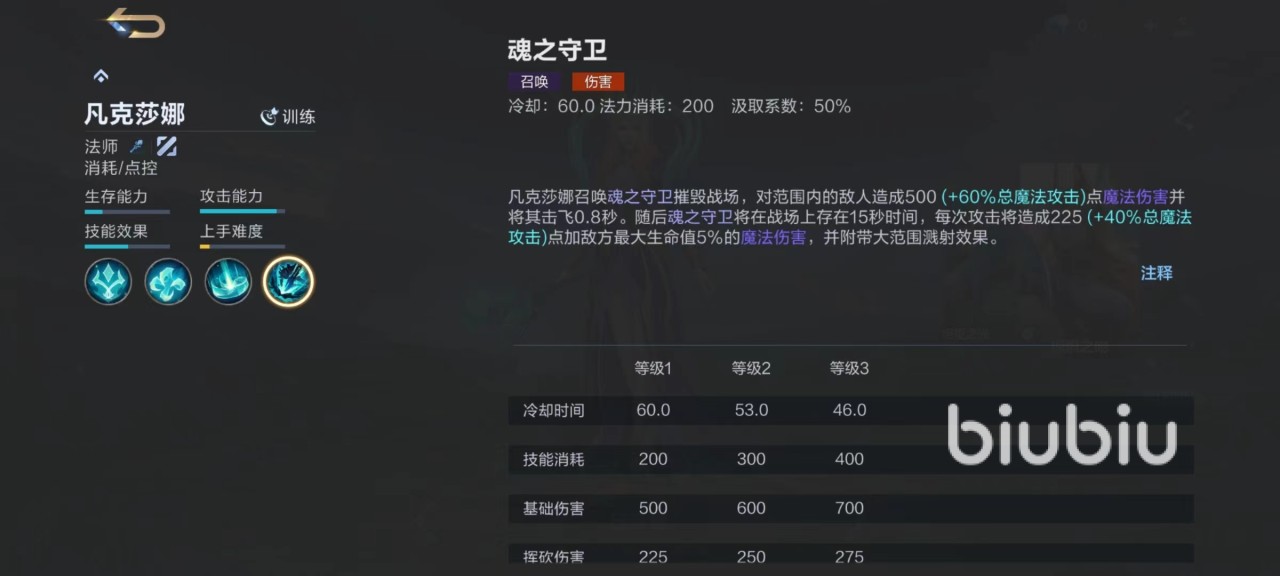 二技能对范围内敌人造成伤害,此技能也是凡克莎娜最主要的输出来源。三技能会在指定位置召唤守护之魂,造成一次爆炸伤害,守护之魂还会接下来继续输出敌人一段时间,攻击的时候带有溅射效果,再次点击三技能召唤回守卫保护自身。大家从技能效果中就可以看出,只要一套连招能够命中对方,所造成的伤害绝对是爆炸的,尤其是守护之魂更是可以用于接下来强推对方防御塔。