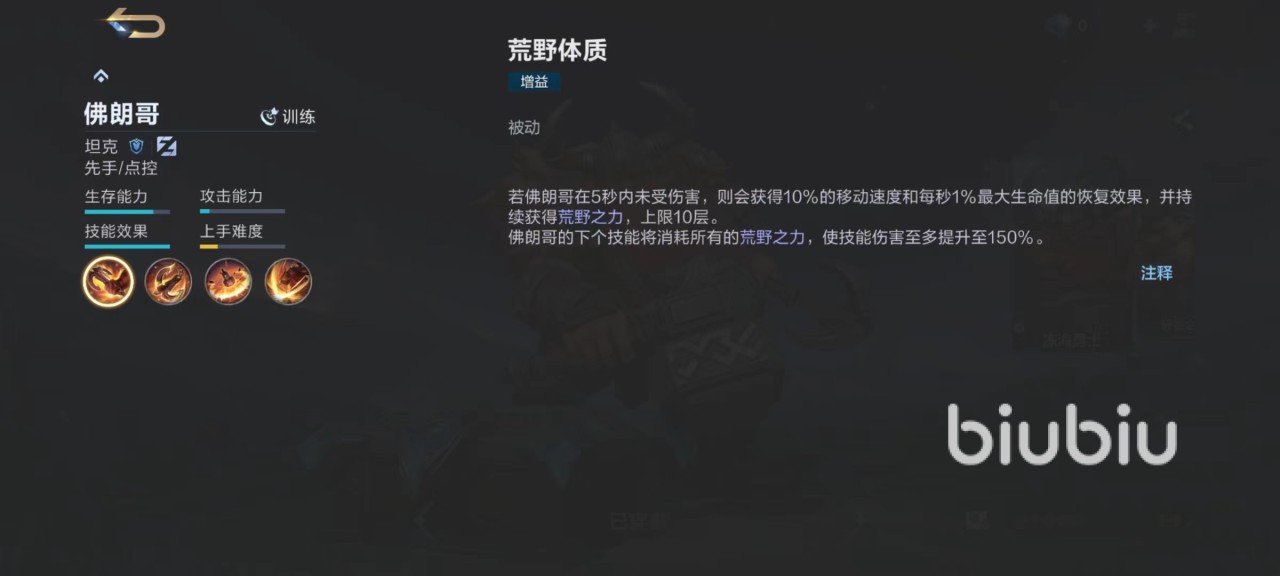 佛朗哥的优势就在于自身属于坦克型选手,有着很好的生存能力,但是在控制效果方面更加出色,是现在数一数二的先手和点控。如果佛朗哥在短时间内没有受到伤害,那么接下来会提高生命值恢复效果和自身移动速度,如果5秒内没有受到伤害,下一个技能会造成额外输出,间隔时间越长伤害就越高。