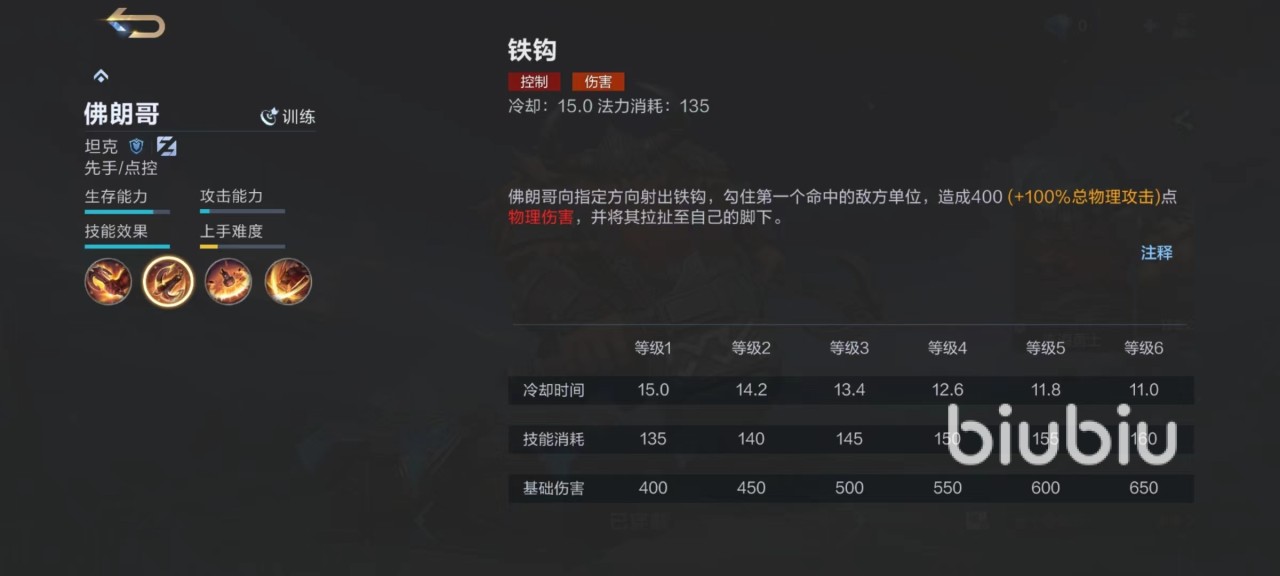 一技能射出铁钩,命中第1个敌人后勾到自己身旁。二技能对周围敌人造成减速和伤害,大招使用后持续压制,指定敌人造成连续输出。从这些技能效果就可以看出,钩子是至关重要的核心技能,输出范围远,将对方拉过来之后可以集火直接秒掉。尤其是一二技能连招,再加上三技能,形成一套非常恐怖的控制链条。所以佛朗哥往往会去走经金币路,辅助射手快速拿下优势,只要对方走位大胆,直接拉过来就能秒掉。