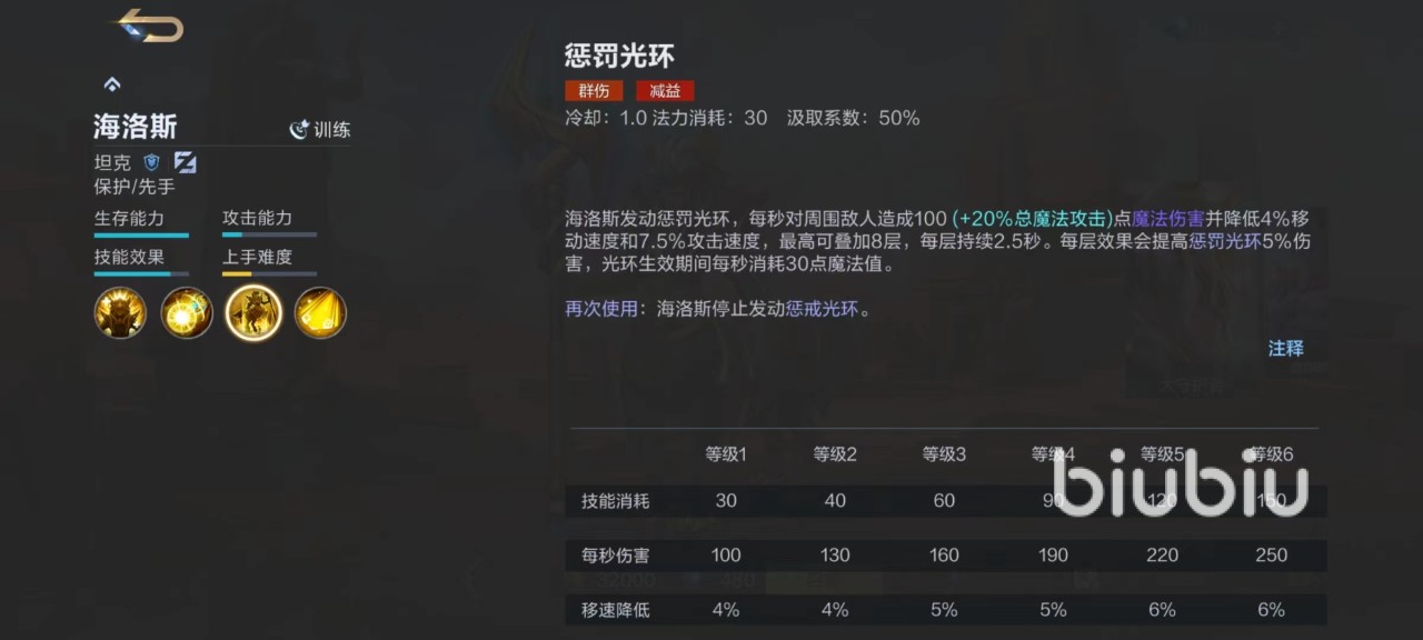 当海洛斯在魔法不足的时候可以消耗生命值来释放技能,这样就不存在因为没有蓝而无法释放技能的情况。一技能对目标造成眩晕和伤害,使用二技能后,在自身周围生成光环,会持续消耗魔法值,对周围敌人造成伤害,并降低移动速度和攻速。伤害方面并不算可观,但是降低移动速度和攻速却可以有效限制对方,而且此技能影响范围极大,在狭窄地区开团可以笼罩对方所有人,再次点击使用后就能关闭光环。