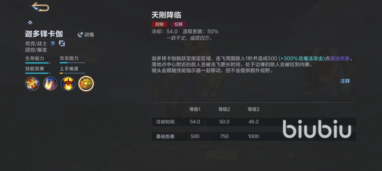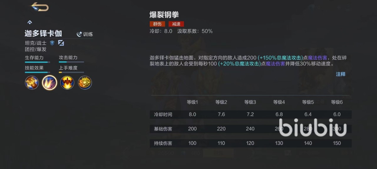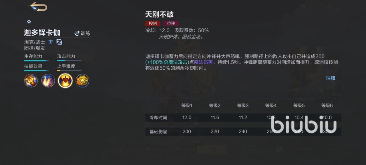 伽多铎卡伽拥有多项控制能力,这在坦克中是不可多得的能力。当其受到伤害时会累积怒气并强化普通攻击,怒气值越多,打出伤害也就越高,所以经常上去挨打有助于提高输出。一技能向前方打出伤害并对敌人进行减速,二技能需要蓄力后释放,朝指定方向冲锋并嘲讽路径上的敌人,在蓄力的时候可以随时调整方向,起到出其不意控制效果。