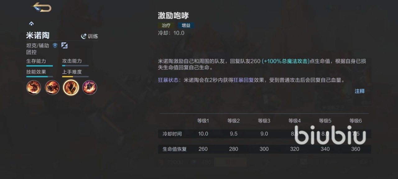 二技能使用后为自身和周围队友恢复体力值,短时间内提高己方攻速,狂暴状态下米洛陶将会获得狂暴恢复效果,受到普攻后恢复自身血量。三技能开启后,进入怒气积攒状态持续获得怒气,在满怒状态下使用该技能直接进入狂暴状态,还会连续攻击地面三次。前两次附加伤害及减速,最后一次直接将敌人击飞,在狂暴期间还不会受到控制效果影响。