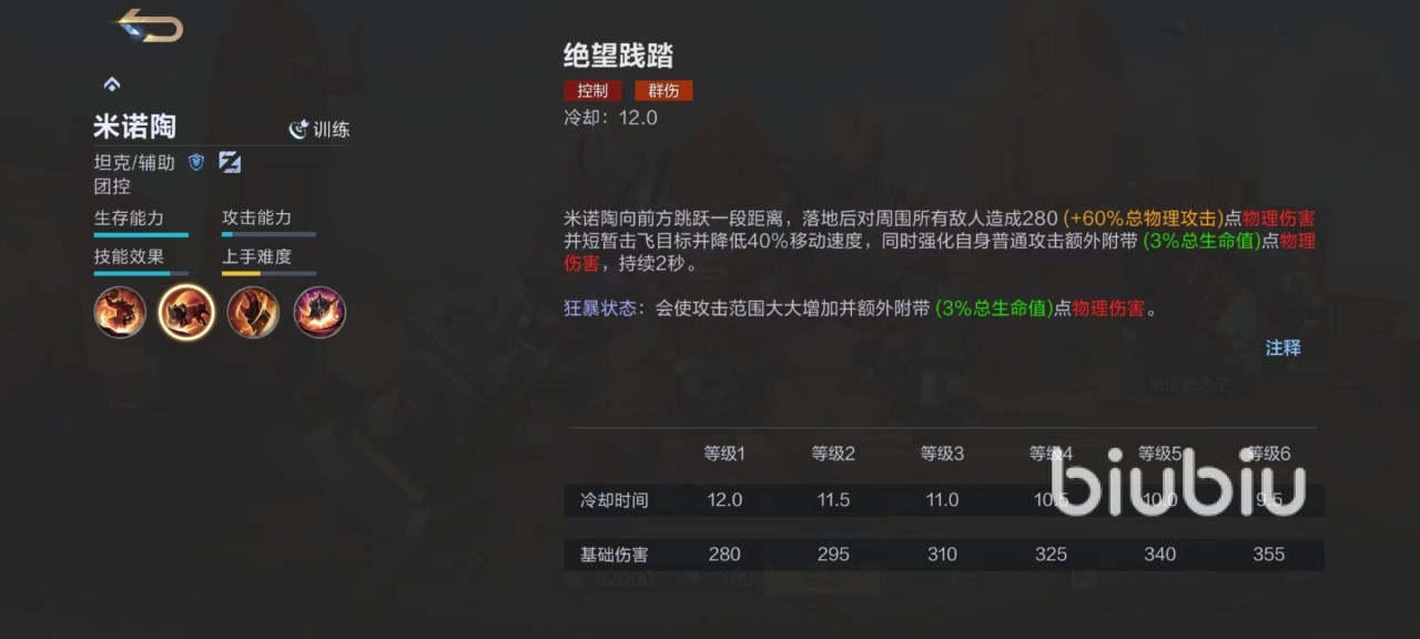 米诺陶在生存能力方面非常优秀,攻击敌方或者受到伤害时都会叠加怒气,当怒气达到满值时,可以通过强化自身三技能来进入狂暴状态。在此状态下攻击、防御力都有加成,当狂暴状态消退时,米诺陶短暂时间内无法获得怒气和使用米诺斯之怒技能。一技能向前方跳跃,落地后对附近敌人造成击飞和伤害,同时降低伤害目标攻速和移动速度,还能在接下来提高普攻伤害,如果是狂暴状态下攻击范围增大,伤害提升。