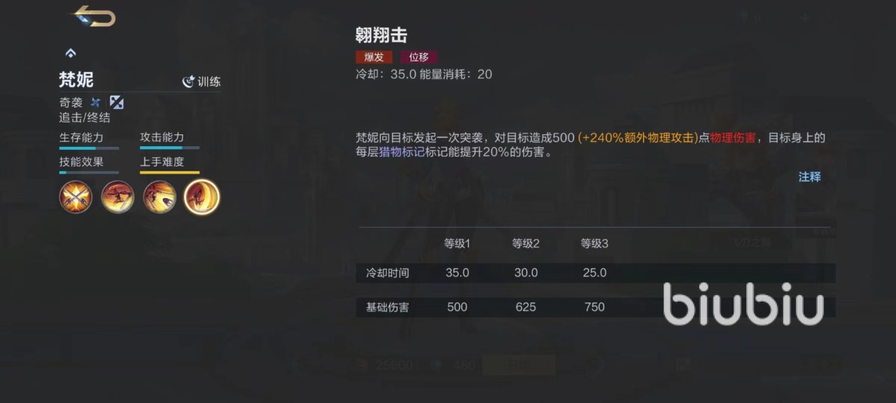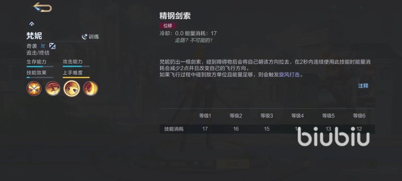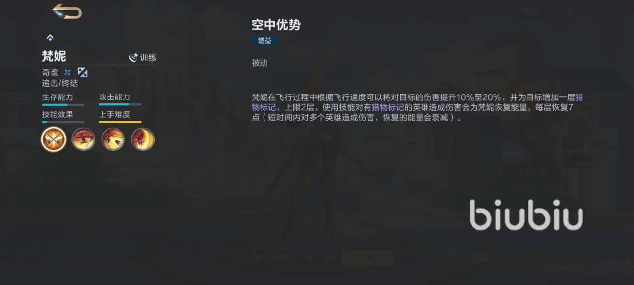 因为自己的技能效果,所以梵妮在操作的时候非常灵活,这也给使用造成了一定的难度,能够借助障碍物实现多段飞行,在场上到处穿梭。飞行过程中根据飞行速度,提升对目标的伤害,并且为目标添加印记,凡是技能命中被标记的敌人都会恢复自身能量。如何控制好能量也是用好证明角色的重要方面。