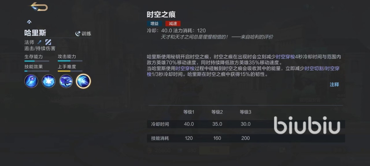大招能开启时空裂痕,在每次触碰后都会减少其他技能冷却时间,同时降低自身受到控制的影响时间,还能降低敌方的移动速度。大招才是这名角色关键的地方,如何释放以及选择的时机和位置,将会影响整个技能连招使用以及连招输出。毕竟减少冷却时间非常关键,而且还要让尽量多的敌人受到减速影响,将对方阵型分割开。