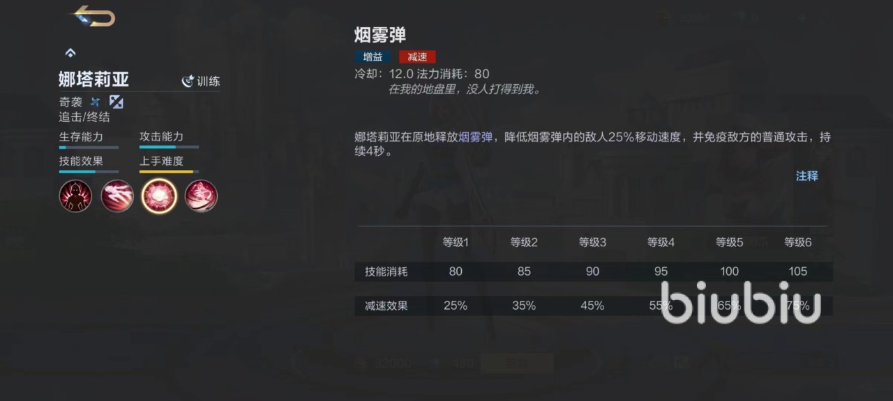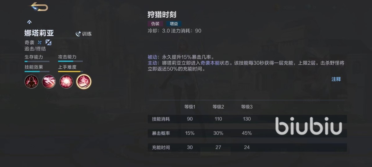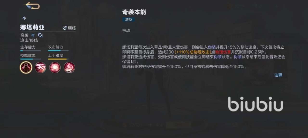 在属性方面自身生存能力极低,即使在奇袭和射手等角色中,也是比较低的一个。这就给大家使用的时候带来一些压力,所以有着较高的上手难度,攻击能力和控制效果较为出色。当娜塔莉亚进入到草丛中时,如果没有受到伤害,则会进入到伪装状态,此状态下获得隐身,并且下一次普攻会瞬移到敌人身后,在输出同时将目标沉默,是极其好用的先手技能,也是玩家非常害怕遇到他的原因。