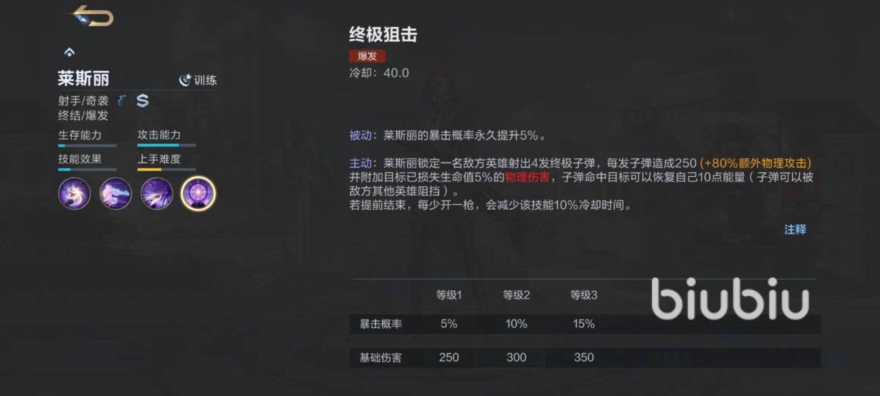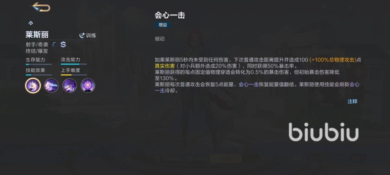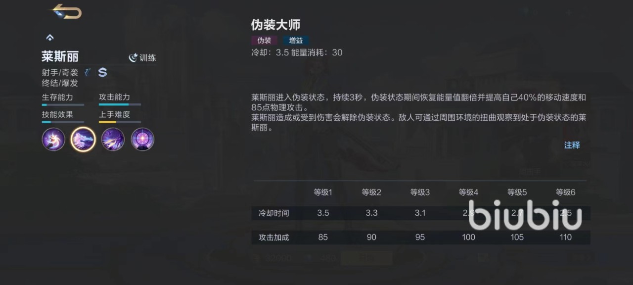 莱斯丽作为典型的灵活高爆发奇袭型射手,出色的攻击力和攻击距离是必须要利用好的能力。在一段时间内未受到伤害,下一次普攻就可以带来更远攻击距离和更高伤害。一技能使用后直接进入到伪装状态,注意伪装并不是隐身,仔细看还是能看到一些轮廓,但如果借助草丛和其他掩护,也可以达到很好的隐藏目的,另外还能短暂提高移动速度和攻击力。