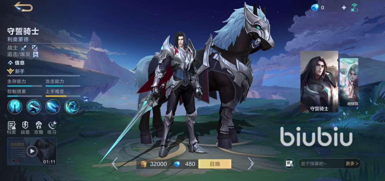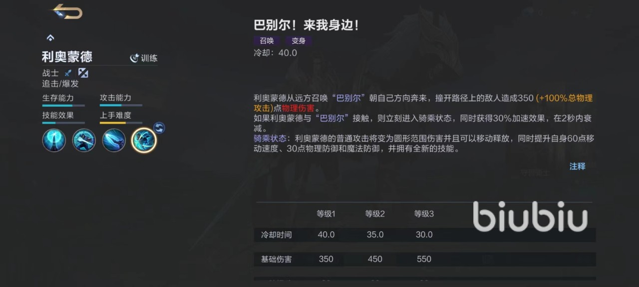 二技能向指定方向进行冲锋,对冲锋终点和路径上的敌人都会造成伤害及减速效果。三技能使用后直接将自己的战马巴比尔召唤出来,将路径上的敌人撞开并造成伤害,当自身接触到巴别尔时,进入到骑乘状态,所以利奥蒙德也属于能够变身的英雄之一。骑上战马后,移动速度和防御得到提升,可以骑战马在场上直接输出,普攻也变成了范围伤害,同时一、二技能替换为新效果。