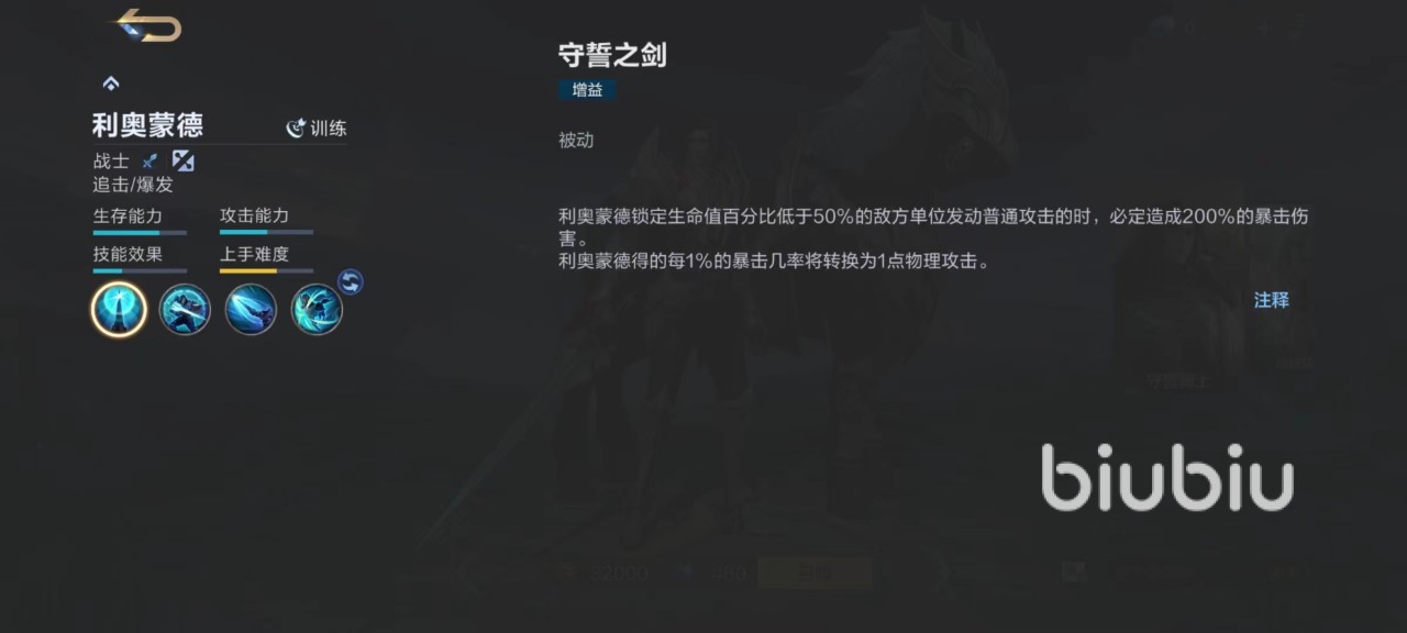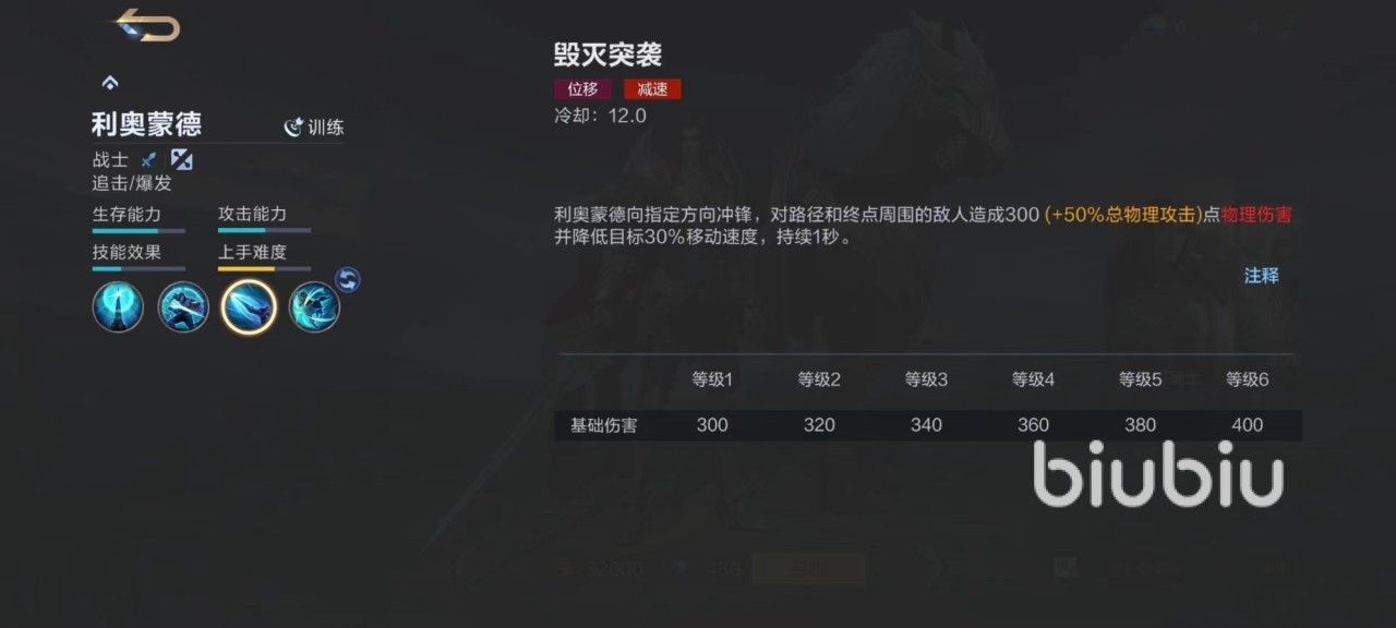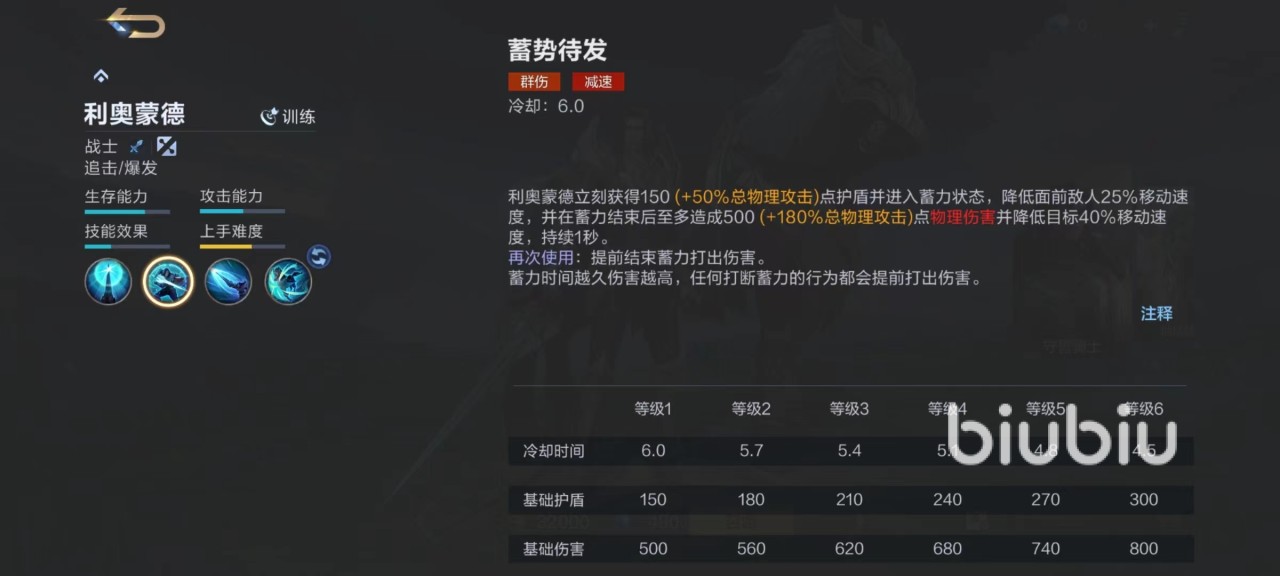在游戏中利奥蒙德非常擅长追击和打出爆发输出,是一名很出色的战士型角色,在生存能力方面也很优秀,不惧怕对方输出,但因为自身技能缘故,所以上手难度较高。利奥蒙德对于体力值低于一半的敌人进行普攻时候会造成暴击伤害,这样在攻击残血敌人时能够做到刀刀暴击,输出极为残暴。一技能使用后自身获得护盾并开始蓄力,蓄力结束后,攻击从面前经过敌人并减速,蓄力之前可以调整方向,蓄力过程中不能移动,蓄力时间越长减速效果越好,也可以提前结束。