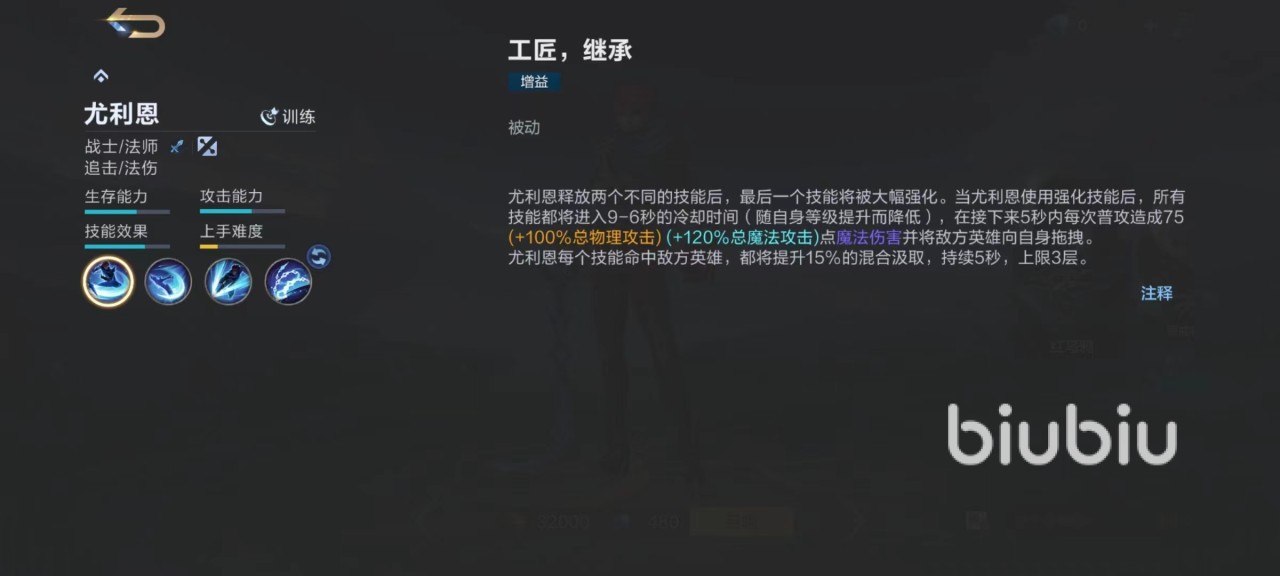 尤利恩是非常擅长控制和爆发输出的战士兼法师,当释放两个不同技能后,最后一个技能会得到大幅度强化,使用强化技能后所有技能都将进入冷却时间。在短暂时间内普攻进化为强化普攻,造成额外伤害并且将敌方英雄进行拖拽,这样独特的被动效果,就注定了尤利恩在使用方面和其他很多英雄都不相同。