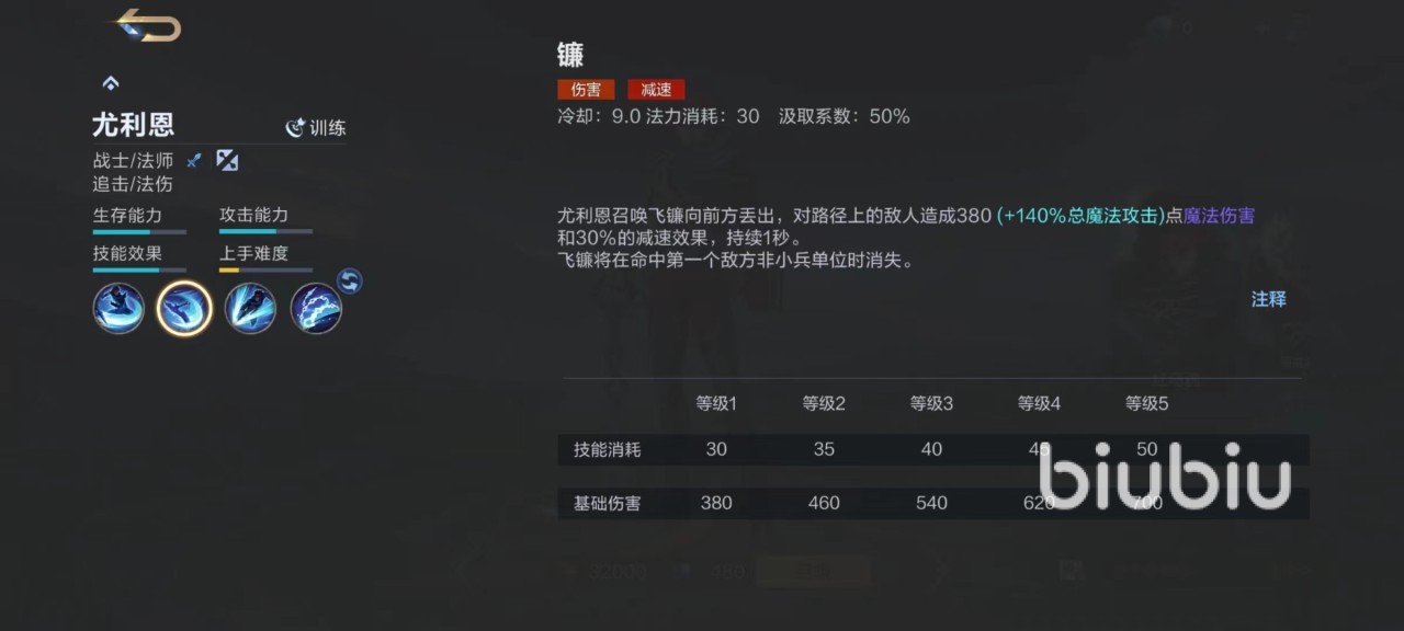 一技能向前方投掷飞镰,对路径上的敌人造成减速和伤害,当飞镰命中第1个敌人或者野怪时消失。一技能获得强化后减速效果提升,并且飞镰命中第1个目标或达到最远距离后会继续减速飞行,造成范围伤害。二技能向前方冲刺,对路径上敌人造成伤害,在强化状态下使技能可以对路径上敌人造成更高的持续伤害,并且在冲刺期间变为不可选中状态。三技能召唤出锁链丢向指定地点伤害范围内的敌人造成禁锢效果,在三技能获得强化后,对范围内敌人造成伤害,同时附加减速和击飞效果。