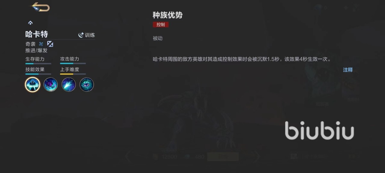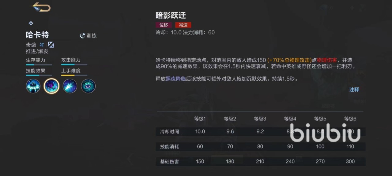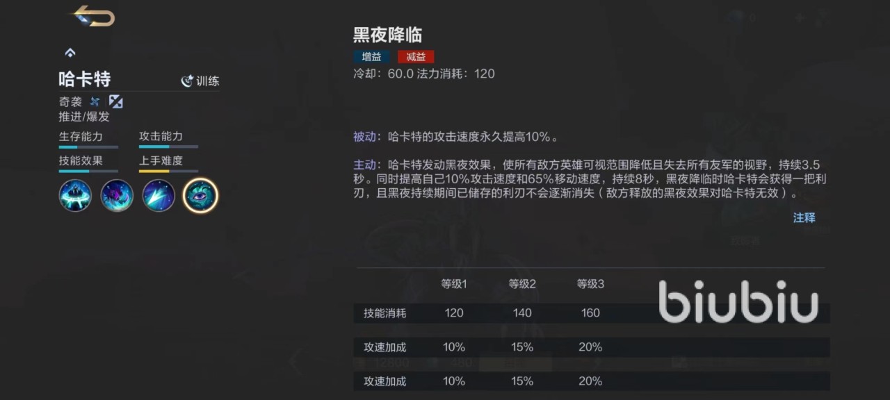 当哈卡特在战斗中被对方使用控制技能后,敌人就会被沉默,这使得哈卡特根本不惧那些拥有控制技能的角色,该效果每4秒就可以生效一次。一技能向指定区域位移,并对落地范围内敌人造成伤害和减速,开启大招之后,一技能会额外添加沉默效果。二技能普攻能够积攒利刃,使用技能后将身上所有利刃扔出,对敌人造成伤害和减速。当开启大招之后,所有敌方英雄都会失去友方视野,同时提高自身攻击速度和移动速度,大招期间所储存利刃不会消失。