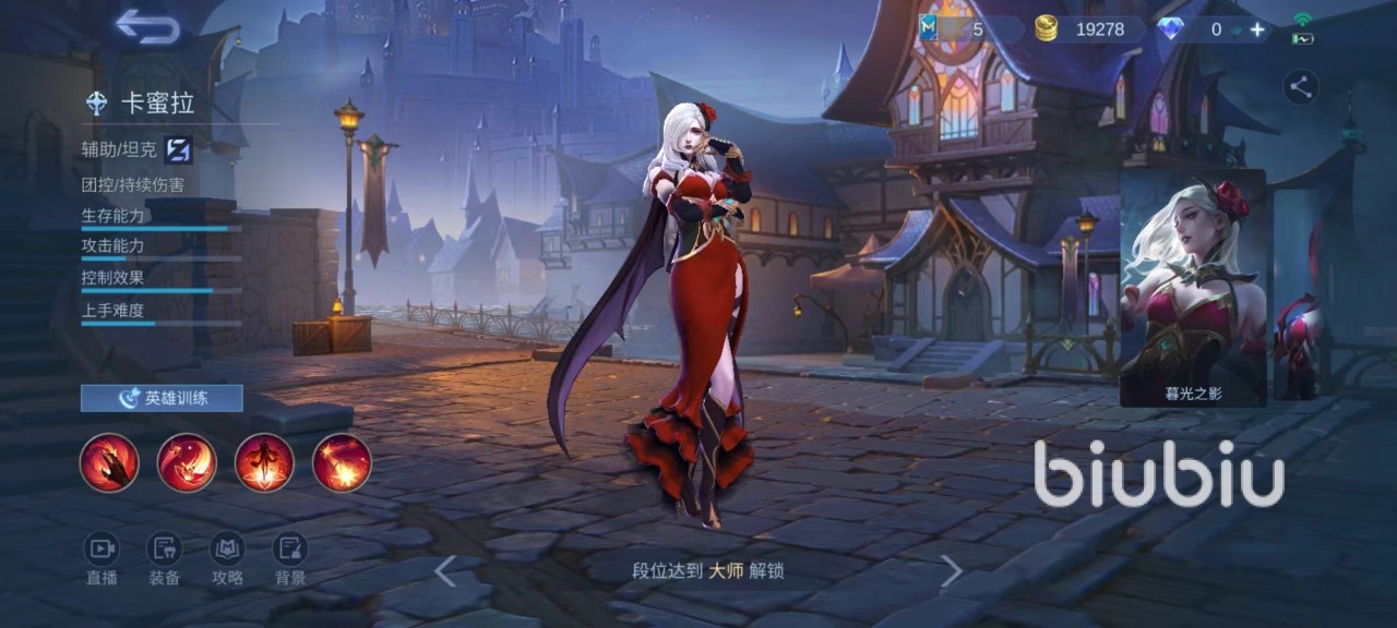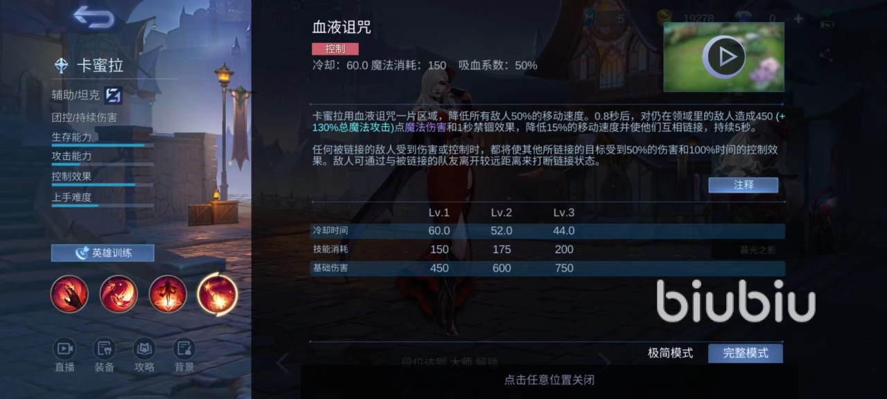 一技能血恋花,召唤出两朵血恋花围绕自身旋转,持续5秒钟,每次命中目标都会加快旋转速度,造成魔法伤害和减速效果,另外在血恋花每次伤害目标时还会为卡蜜拉恢复血量。二技能需要卡蜜拉先积蓄血杀能量,增加自身移动速度,再次点击使用对敌方指定目标打出能量,造成魔法伤害和眩晕,此技能伤害将会随着能量积蓄时长而提升。大招血液诅咒。开辟出一片区域,所有敌人在区域内都会降低移动速度,如果敌方在0.8秒钟之后依然在区域之内,则会受到高额魔法伤害加禁锢效果。还能使它们相互连接起来,连接效果是任何被连接的敌人受到伤害或控制,都会使其他被连接目标同样受到伤害和控制,敌人可以通过远离来打断连接状态。
