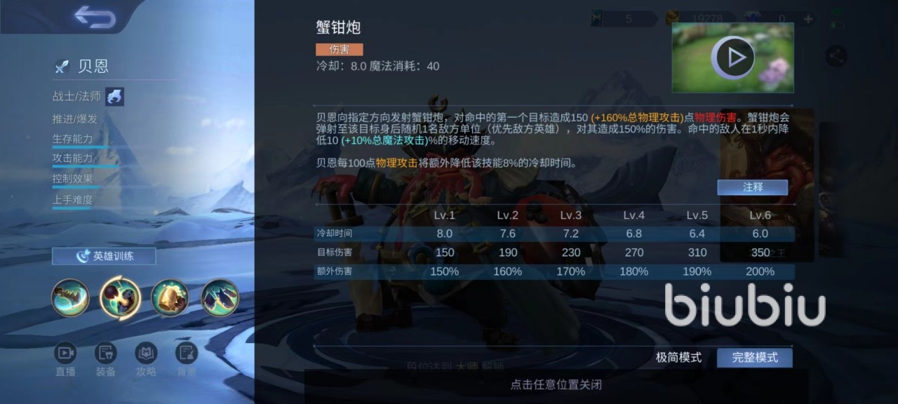 贝恩的被动效果是在每次释放技能时,都会使自己手中的武器灌注一层潮汐之力,下一次普攻会消耗一层潮汐之力,造成范围伤害。这样的被动就使得贝恩在使用的时候需要频繁释放技能,然后将触发的被动效果打出去,这样才能做到伤害最高。一技能朝指定方向发射炮弹,命中第1个目标后停止,另外还可以进行弹射伤害目标身后随机一个单位,并降低敌人的移动速度。