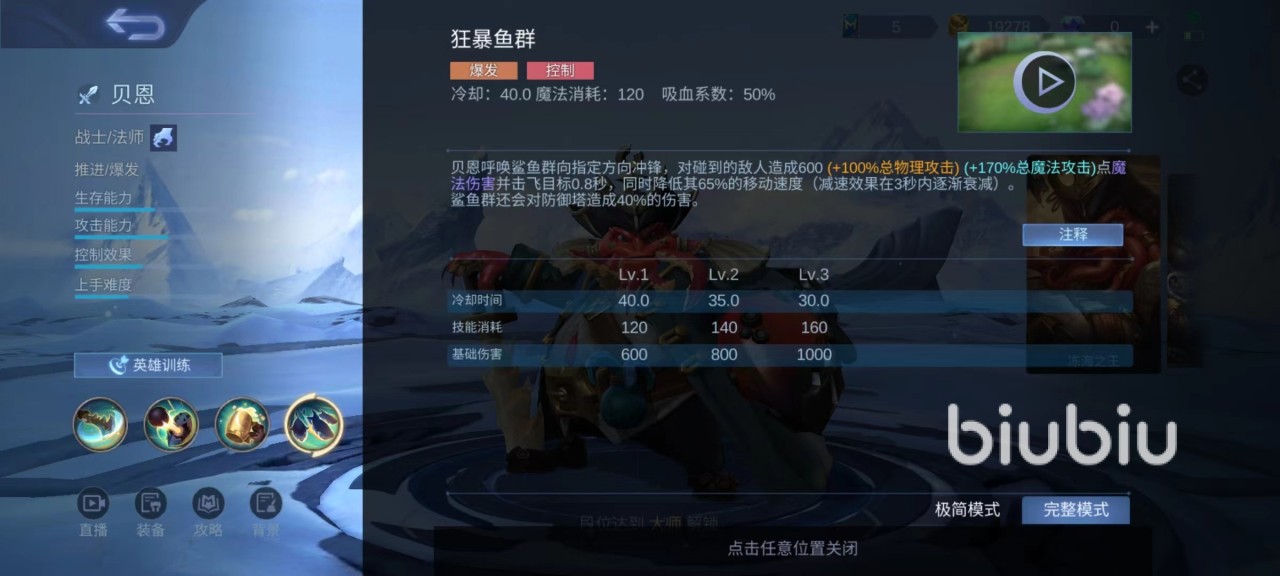 第3个技能召唤鲨鱼群朝指定方向冲锋,碰到敌人后造成魔法伤害并将目标击飞,同时降低移动速度,召唤出来的鲨鱼群还可以对防御塔造成伤害。有了这样的技能效果呗,在中路就有了自己的优势,那就是利用技能不断去消耗目标,无论是1、2技能都可以打出相当可观的伤害。