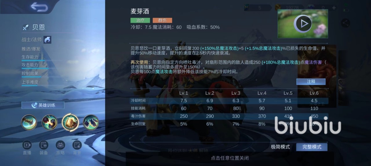 二技能使用后立即回复贝恩少量生命值,自身损失血量越多,恢复的也就越多,同时提高移动速度,在接下来2.5秒钟之内加速效果会快速衰减。该技能点击后可以再次使用,向指定方向喷毒汁造成扇形范围伤害,该技能通过蓄力可以将伤害提升。身上魔法攻击属性将会降低此技能冷却时间,所以有很多玩家去选择堆魔法装备,就是为了利用麦芽酒伤害特点,不断喷出伤害,然后触发被动去打一个输出循环,这也是现在常用的连招方式。