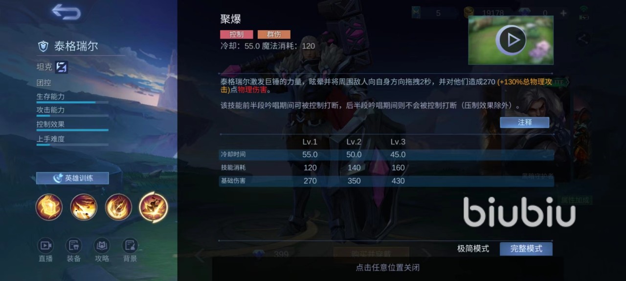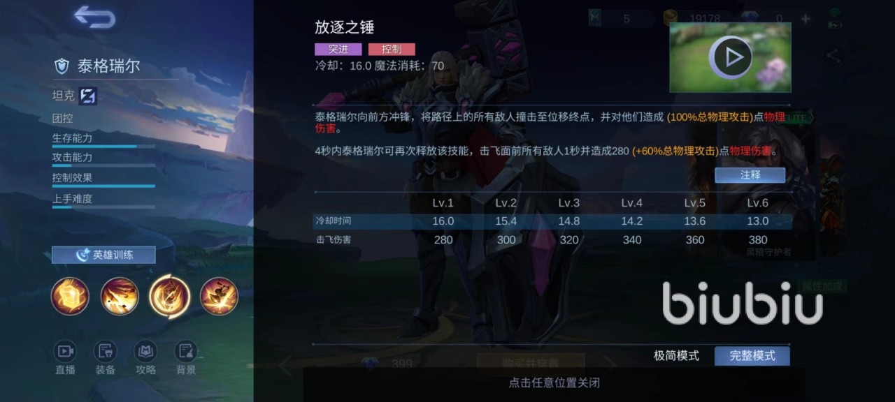 二技能放逐之锤向前方指定位置冲锋,路径上的所有敌人都会被撞击到位移终点,并造成物理伤害,在四秒后可以再次点击释放该技能,将面前敌人击飞。三技能激发出巨锤力量,将周围敌人眩晕并朝自身方向拖拽,造成物理伤害,该技能需要吟唱一段时间,在前半段可以被打断,后半段则不会被打断。所以泰格瑞尔还是比较惧怕一些具有强势指向性控制的角色,因为大招一旦被打断,就使得团队失去了最强势的控制,所以要避开对方控制型英雄释放,或者是卡对方的技能冷却。