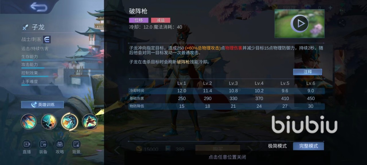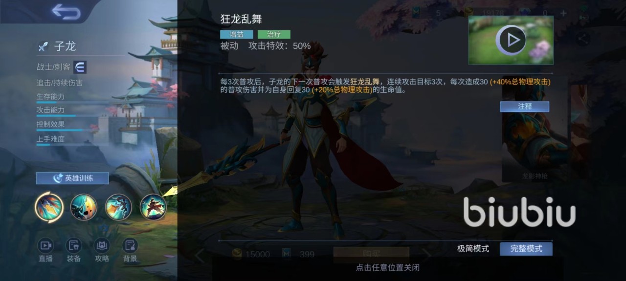 在该英雄被动影响下,每进行三次普攻,下一次普攻就会获得强化效果,攻击时触发狂龙乱舞,能连续攻击目标三次,每次造成伤害后还会恢复自身生命值。这也是子龙可以进行打野的保障,实现无伤快速清野怪,后期依靠普攻打出伤害也是必修课。一技能将敌人挑飞到背后造成物理伤害。