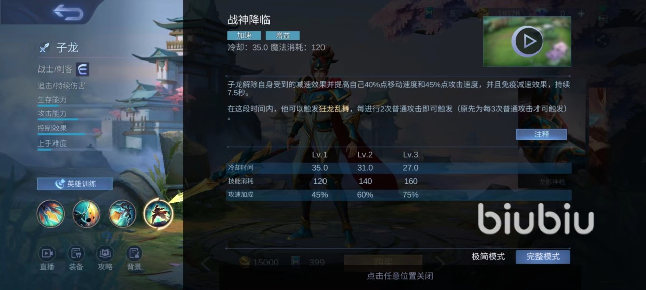 子龙就是一个非常依赖普攻的英雄,这一点在出装备的时候大家要尤其注意,自身非常依赖大招,也只有在大招开启后才可以无视对方控制,在场上快速收割输出。利用好短暂时间内带来的攻击速度加成快速切掉对方射手。实战中的连招可以选择由二技能直接切入,然后接上一技能,穿插进普攻,最后开启大招实现收割,当然也可以在战斗前直接开大招往里冲。