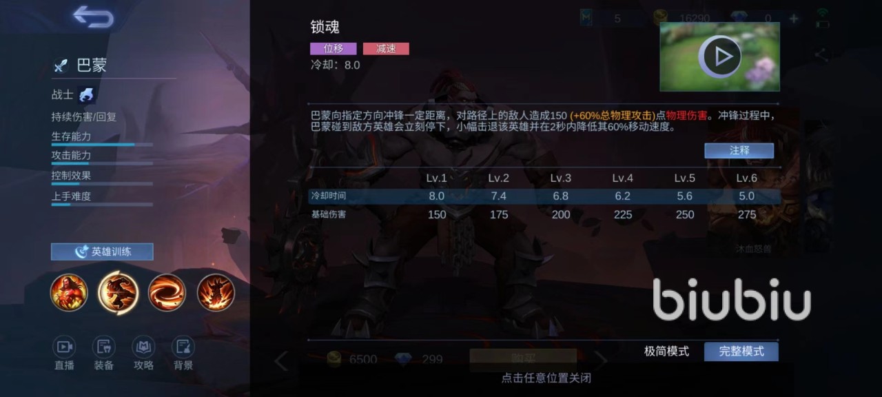 在被动的影响下,巴蒙击杀士兵或者是野怪能恢复自身5%最大生命值,如果击杀的是英雄,则恢复20%的生命值。这也就意味着在线上的时候巴蒙可以肆无忌惮的和对方换血,只要能够快速清兵,就能够保证自己血量健康。一技能向前方冲锋一段距离,对路径上的敌人造成物理伤害,在冲锋的过程中,如果碰到敌方英雄会立即停下来将其击退并,降低移动速度。