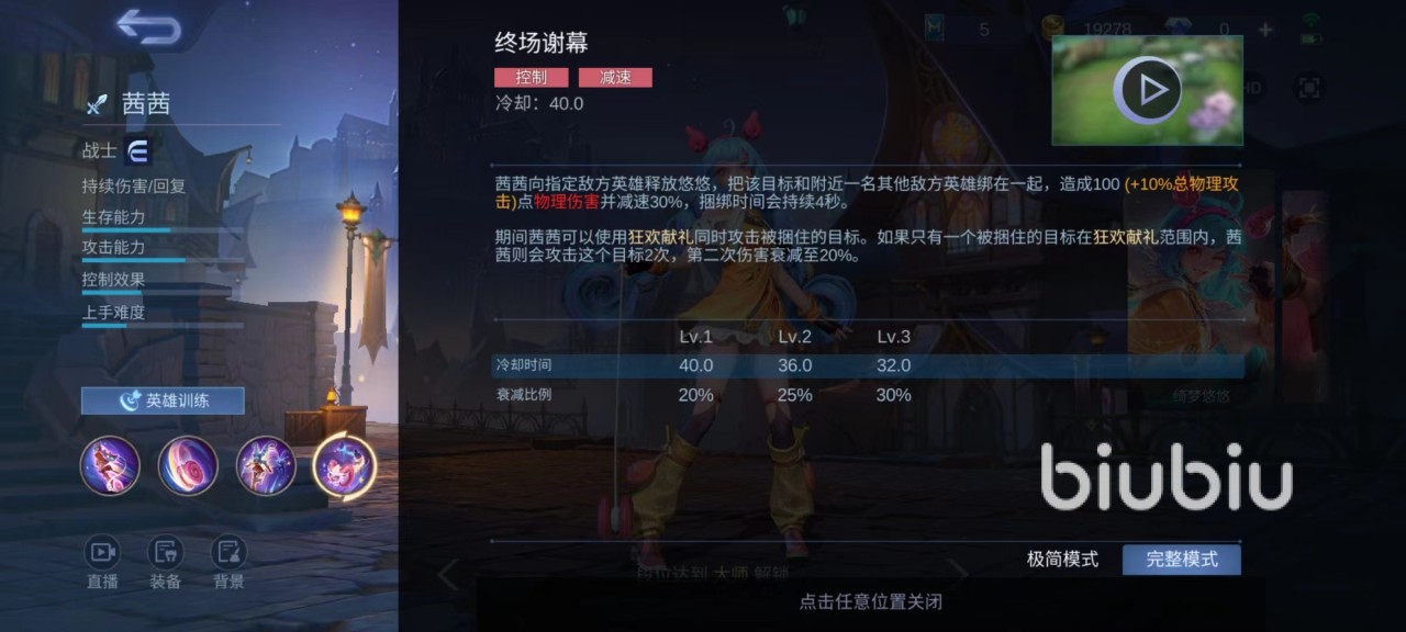 三技能向指定的敌方英雄释放悠悠球,将目标和附近一名英雄捆绑在一起,造成物理伤害和减速,捆绑时间持续4秒钟。在此期间内茜茜可以使用一技能同时攻击被困住的两个目标,如果只有一个在技能施法范围内,则会攻击该目标两次。综合这些技能效果可以看出,这名角色并没有太过突出的爆发,在实战中可以利用自身的恢复能力优势以及持续作战优势,霸住自己的线进行发育。