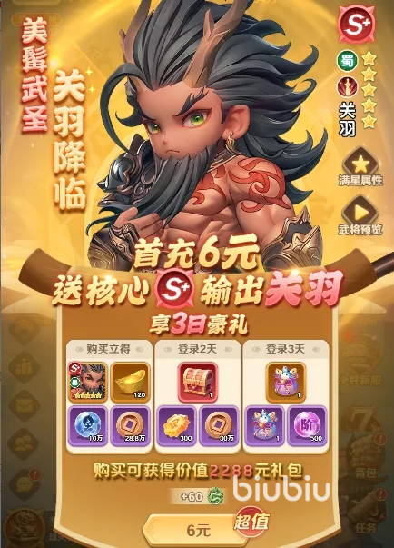 首先比较推荐的自然是“首充”,首充只需要6元,性价比超高,是很值得投入的项目,首充可以让玩家在初期就获得高级武将关羽,这个武将对于前期的开荒帮助作用很大,使整体战斗都更加流畅,还能连续领取三天的奖励,甚至能跳过战斗,还是非常划算的。