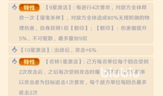并且自身会获得1层印记,让伤害提升5%最多能叠加9层,名将1星能在己方每回合受到2次攻击后,之后每次受到攻击,魔吕布就会对攻击者进行一次追击,3星后队友攻击暴击有概率追加一次普攻,神将1星会对带有护盾的目标额外提升20%伤害。