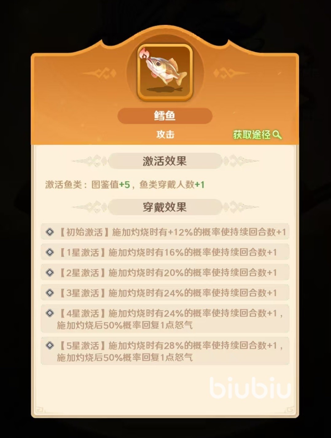 还有一些鱼类同样适合搭配,例如三文鱼,三文鱼的效果是被攻击时有几率给攻击者添加灼烧状态,持续两回合。但这条鱼和周瑜的配合程度并不高,因为周瑜并不是属于前排,他更适合给周瑜其他的前排队友搭配上。同样适合前排队友选择的还有鲟鱼,鲟鱼的效果是死亡时有几率对全体敌人添加灼烧状态,不适合周瑜但给队友带上效果也很出色。在大型鱼类方面,目前并没有比较适合周瑜或者是灼烧队选择的类型,所以目标应该放到提高生存能力上,只要能够增加生存都可以选择。