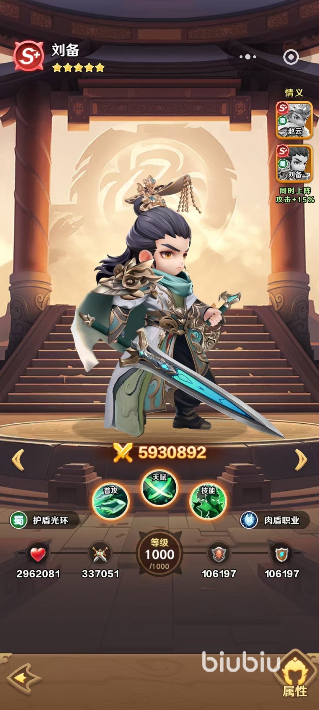 刘备是属于提供护盾和光环的辅助角色,他的天赋是给蜀国武将附加增伤和免伤。技能效果是对全体恢复生命值,并添加护盾和免伤效果,提升整个团队的续航。整套阵容就是依靠张飞的前排抗伤害和提供无敌护盾。这套阵容利用的是张飞为队伍提供防护,配合黄月英的群控沉默减速效果,压制敌方输出。赵云的追击多动机制带起关羽的追击收割能力,加上刘备的光环和诸葛亮的增伤回怒,拉高整个队伍输出上限,快速收割战场。