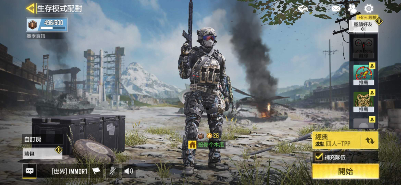 在手游使命召唤中,排位赛模式和多人战斗模式都是需要5名玩家组队进行游戏,目前可以进行四人战斗的就只有生存模式。玩家在生存模式的准备界面上可以看到有组队人数的选项,包括单人模式、双人模式和四人模式,在四人模式下打钩就可以在四名玩家组成小队一起参加战斗了。