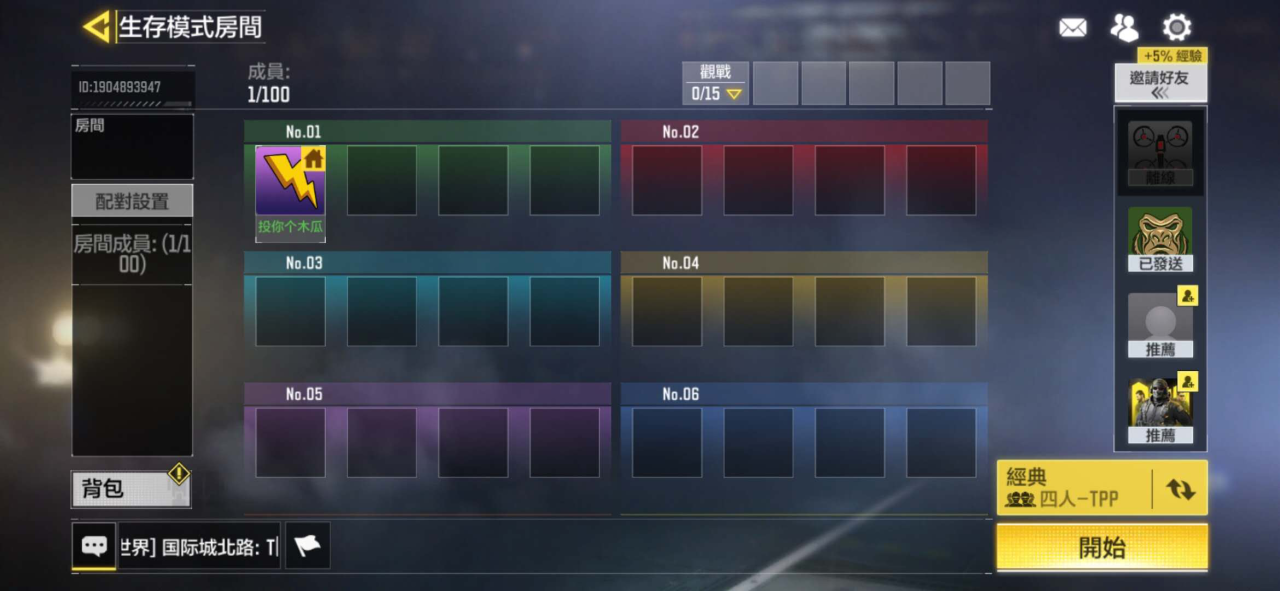 四人组队分为系统随机匹配和自行组队两种,系统随机匹配是根据玩家的段位和语言设置来分配合适的队友,这个适合单人进行游戏的玩家。自动组队则是玩家对游戏中或是登入账号中的好友发出邀请,组成四人队来参加战斗,这个方法是目前胜率最高的组合方法,适合现实中有伙伴一起进行游戏的玩家。