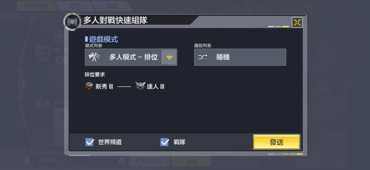 还有一种四人组队方法就是在世界频道进行队友招募,玩家可以自己做队长,将组队要求发送到频道中,通过设置组队条件来筛选出合适的队友,这个方法既可以保证队友质量,又可以弥补现实中好友不足的缺点,是现在使用最多的一种四人组队模式。