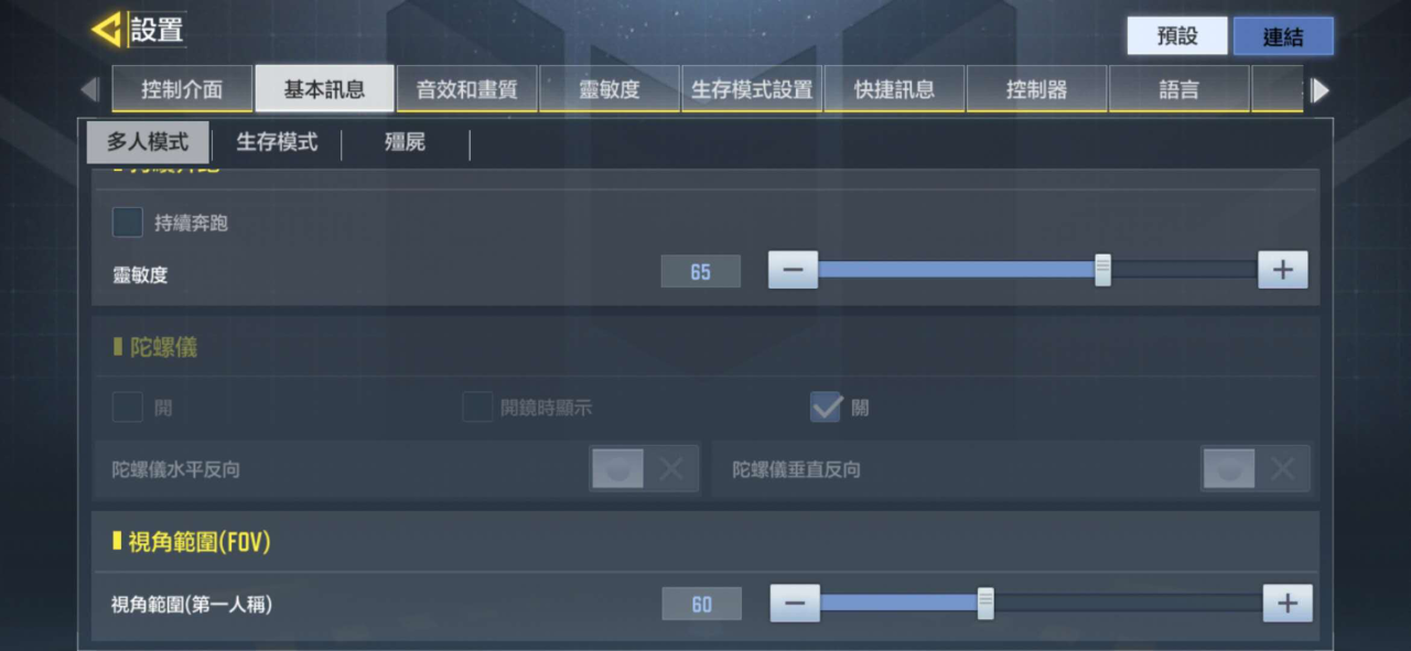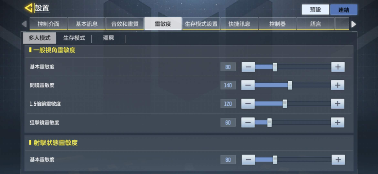 开启了陀螺仪后并不算完,我们还需要对陀螺仪设置灵敏度,在灵敏度功能里,可以为陀螺仪的各项数据设置灵敏度,其中包括基本灵敏度、开镜灵敏度、倍镜灵敏度和狙击镜灵敏度等多种,基本灵敏度就是不开镜行走的灵敏度,开镜灵敏度就是瞄准状态下准星移动的幅度。