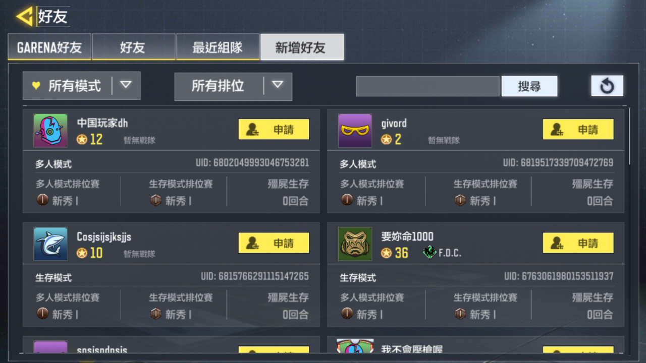 这四种登录方式是不能互相添加好友的,比如手机登录的玩家,只能同样用手机登录的其他玩家,添加不了用邮箱、Faceboo这种登录方式的玩家。不然就算搜索了,也找不到该玩家。