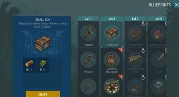 升级到2级后,就能建造木箱、挎包了,这一些是要先行做的,否者咱们手上基本带不下若干原料。