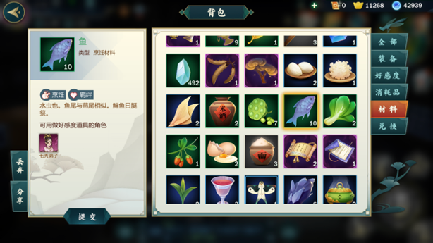 最后所有拾取到的食材鱼,都会在背包的材料里出现,铝的用途也是非常多,可以作为烹饪的材料,也可以当做羁绊好感度来赠送,另外在一些比较特殊的菜品里,鱼的需求量也是比较大的,被玩家在平常游戏时就可以在水里多收集。