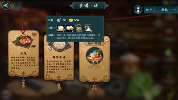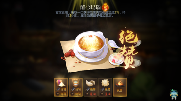 食用酪心玛瑙,每吃一口可以获得内力强度2%的加成,功效持续时间是有两个小时,并且属性还可以进行三层的叠加,是具有特定附加属性加成的一款菜品。