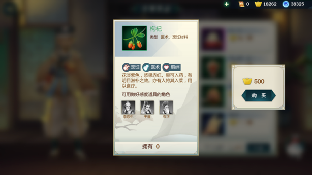 枸杞:枸杞小编是在杂货铺购买得到的。但是杂货铺的东西不是固定的,打开时会是各种不同的东西,如果没有需要的枸杞就可以手动刷新几次。