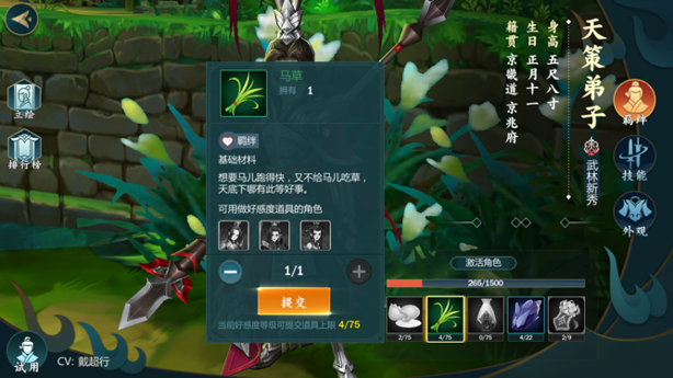 在这些好感度材料当中,小编现在的背包里拥有的是马草和玄铁。以马草为例,当玩家拥有感想好感读材料时,就会有提交的选项,点击提交赠送材料。