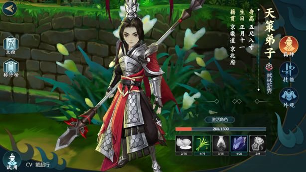 天策弟子解锁需要的好感度是1500,但小编现在的好感度是260。在好感度的下方是天策弟子提升好感度需要的物品,分别是蛋,马草,烈酒,玄铁和虎牙令,可以根据这些物品进行赠送。