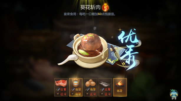 制作成功的葵花斩肉,外形很像是一个狮子头,每吃一口能增加六十点饥饿值,是一款纯增加饥饿值的菜品,没有附带属性,但是饥饿值增加比较大。