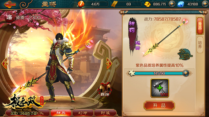 神兵,是每位将领的专门武器。《极无双》中现在有26名将领,此中8名将领已得到了自身专门的神兵。每一件神兵都有着举世无双的酷炫特殊效果,撇开在主城中突显异乎寻常的真实身份外,也给游戏玩家在割草的时候提供了更强的視覺体验。