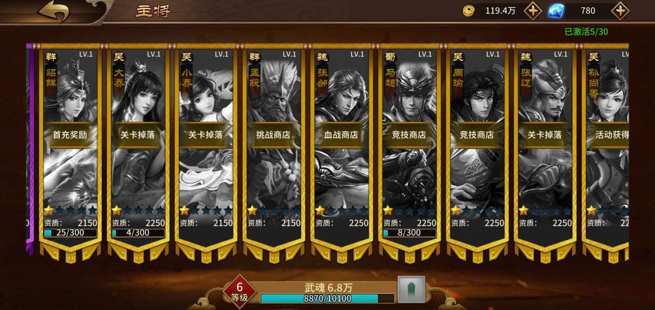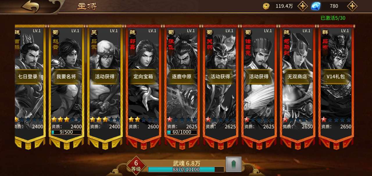 除了关卡掉落的武将,我们在首页选择武将页面,往后查看武将就可以发现,还能通过七日登录、我要名将、定向宝箱、逐鹿中原、无双商店、挑战商店、血战商店、竞技商店、V14礼包、活动获得等多种方式获得新武将。