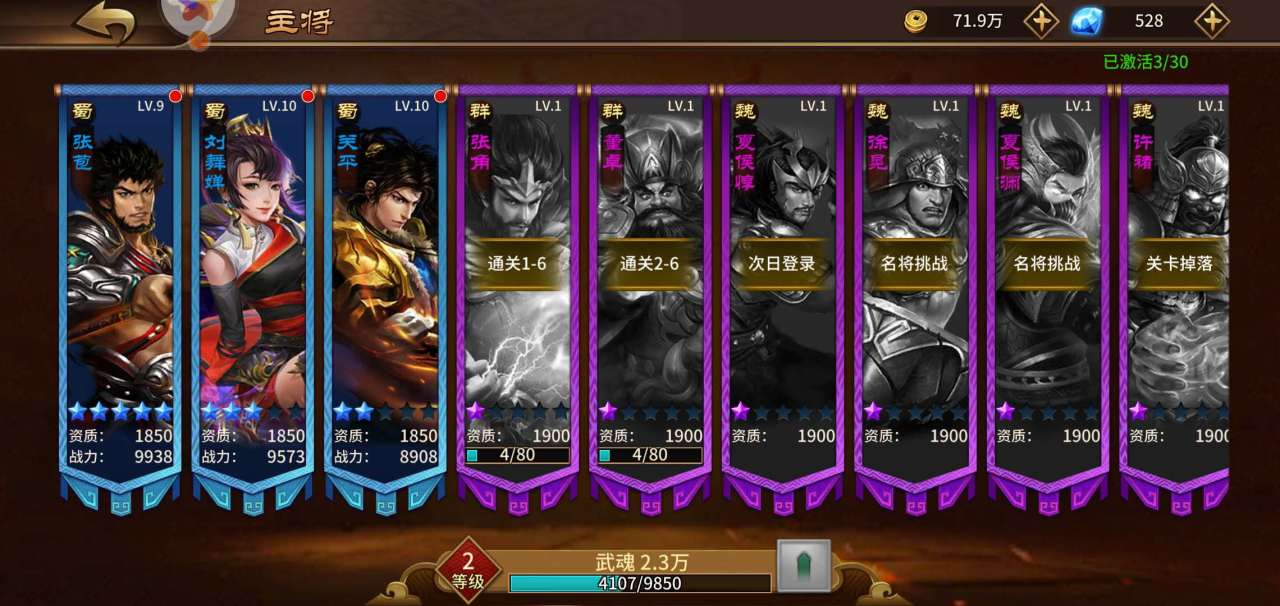 上阵武将最多3个,大于一个时就能换武将了。我们的初始武将是关羽之子关平,那么我们最先的三个武将就是刘关张的后代,关平、刘舞婵和张苞,后面两位在通过第一章相应关卡就能获得,所以三个武将还是很好凑齐的。