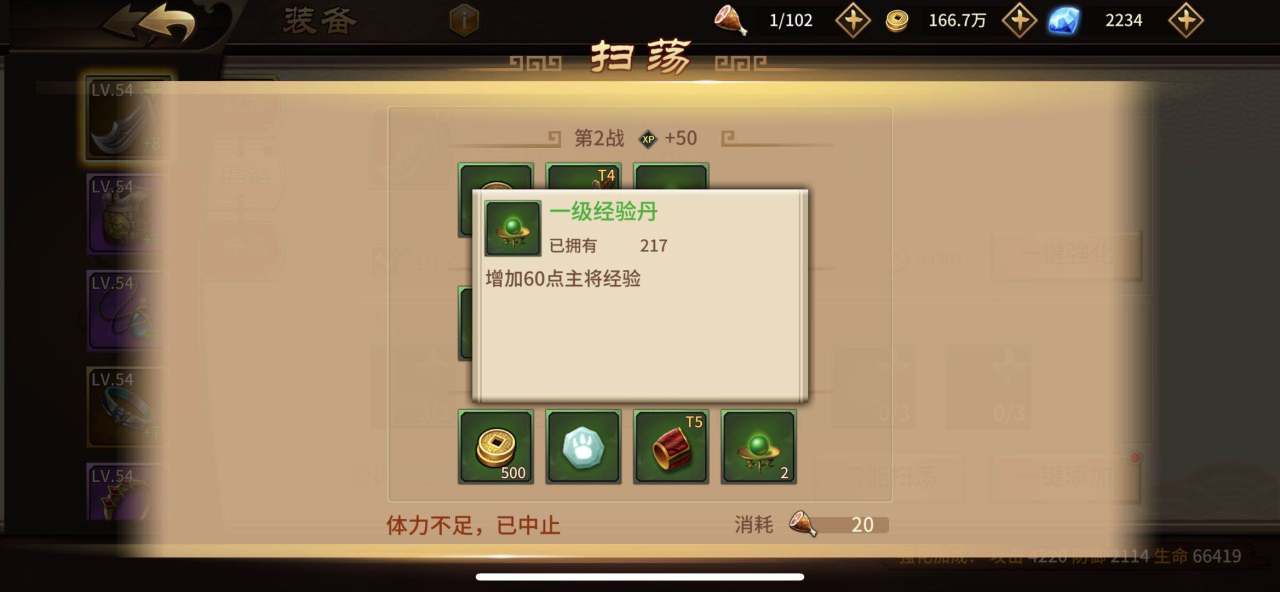 2、通过普通关卡可获得3级内经验丹,我们可以通过扫荡模式大量获得低级经验丹,给予武将前期升级用量。