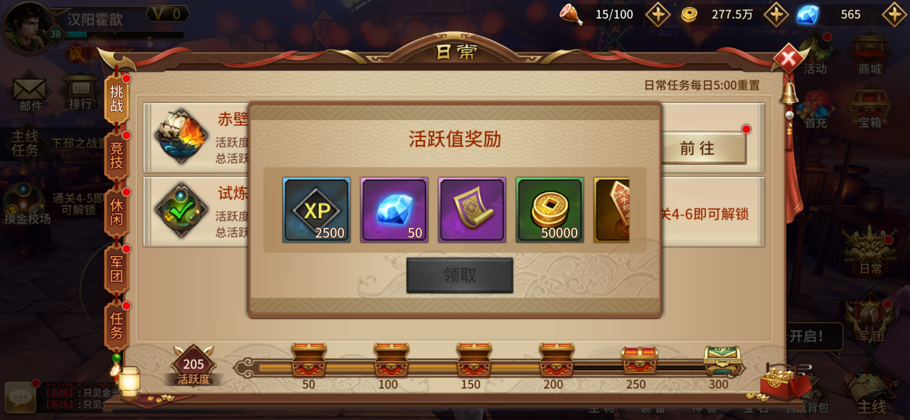 休闲部分提供135活跃度,主要是参与一些游戏内的玩法如吃包子就可获得活跃度。军团系统提供105活跃度,加入一个军团,参与军团建设,基本就可以把这一块的活跃度拿满啦。一天拿完活跃度宝箱的话可以获得10000经验值,想要获得经验的玩家一定不要错过哦。