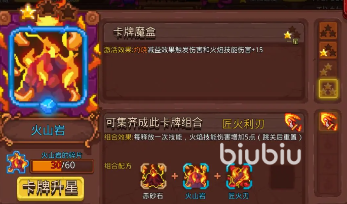 最后再给各位玩家们介绍一下火焰组,主要核心是带火焰魔盒,最好的话可以来个两星以上,对星级有着略微的要求。其他方面,火之牙火焰戒指、赤焰残铁、火山岩、蓄电魔瓶、天导体。这套卡组主要是配合火焰的灼伤伤害来增加额外的伤害效果以及火焰技能的输出,最后与电系的溅射来达成火焰的伤害最大化。